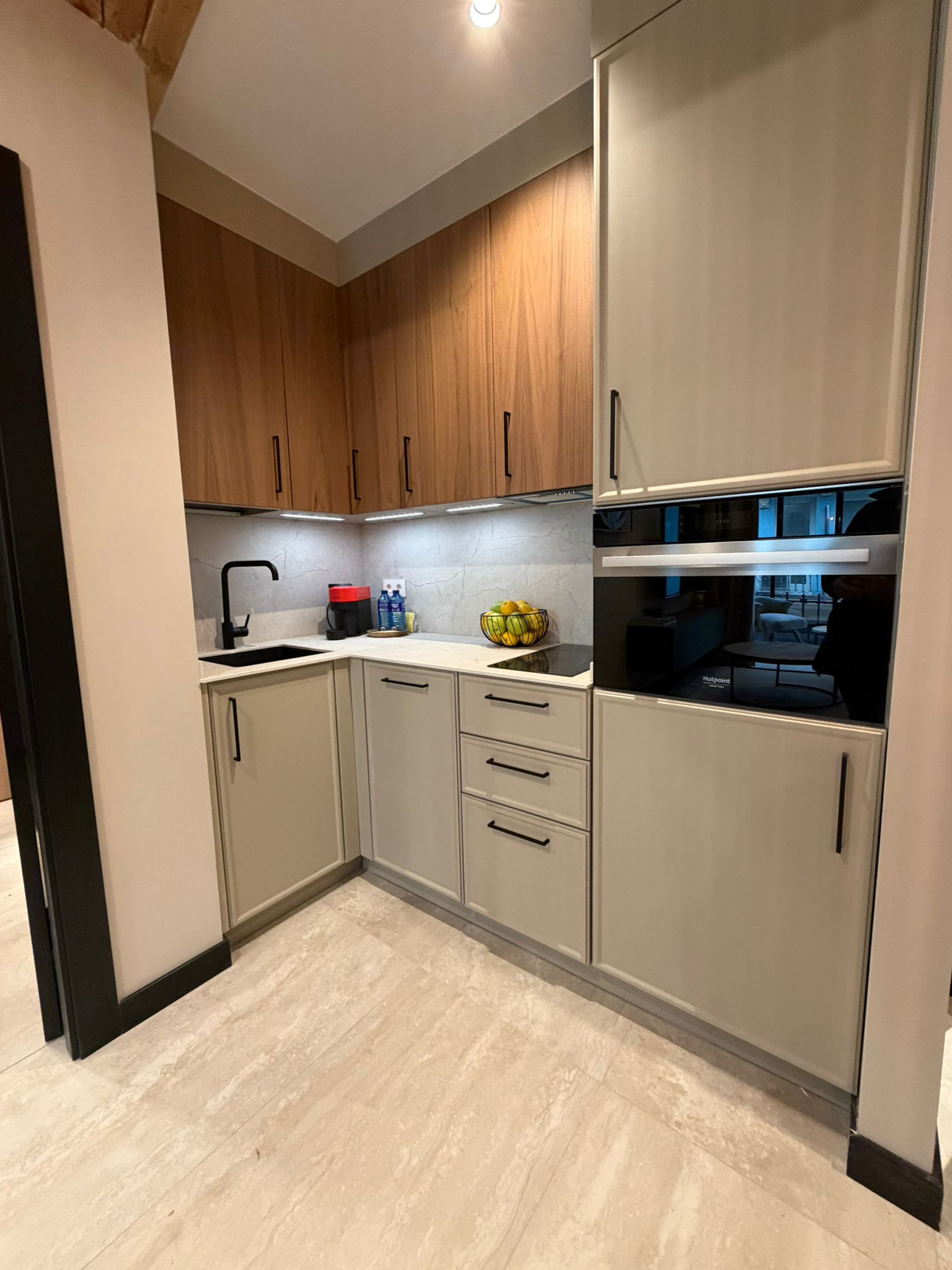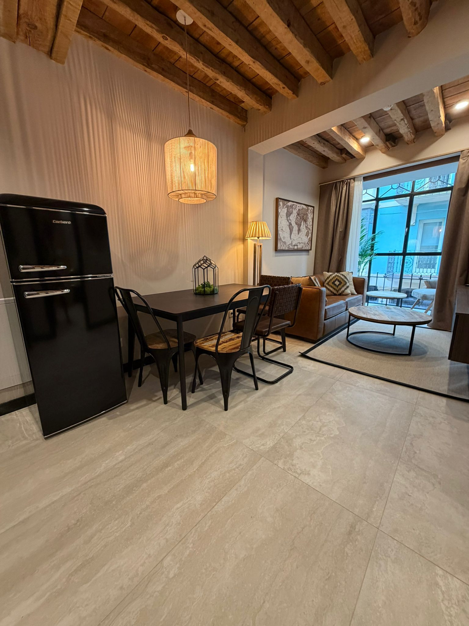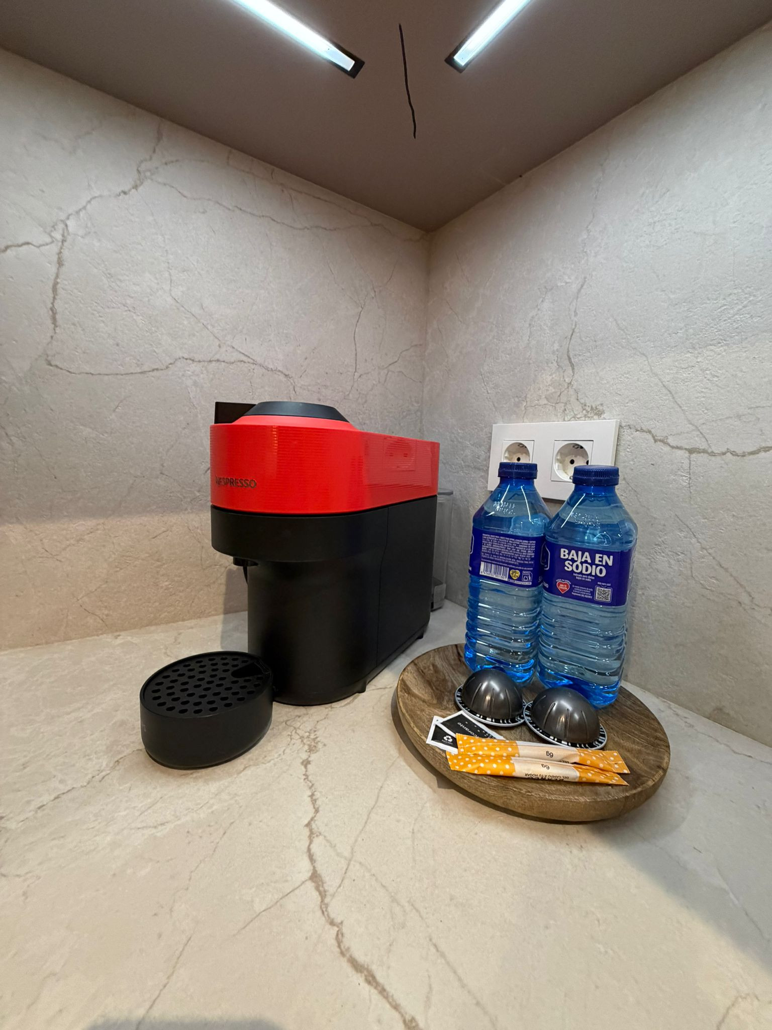 La cocina americana está totalmente equipada con electrodomésticos de última generación, incluyendo nevera, congelador, lavadora, lavavajillas, horno, microondas, cafetera, tostadora y menaje completo. Es un espacio perfecto para preparar comidas rápidas o desayunos antes de comenzar el día.