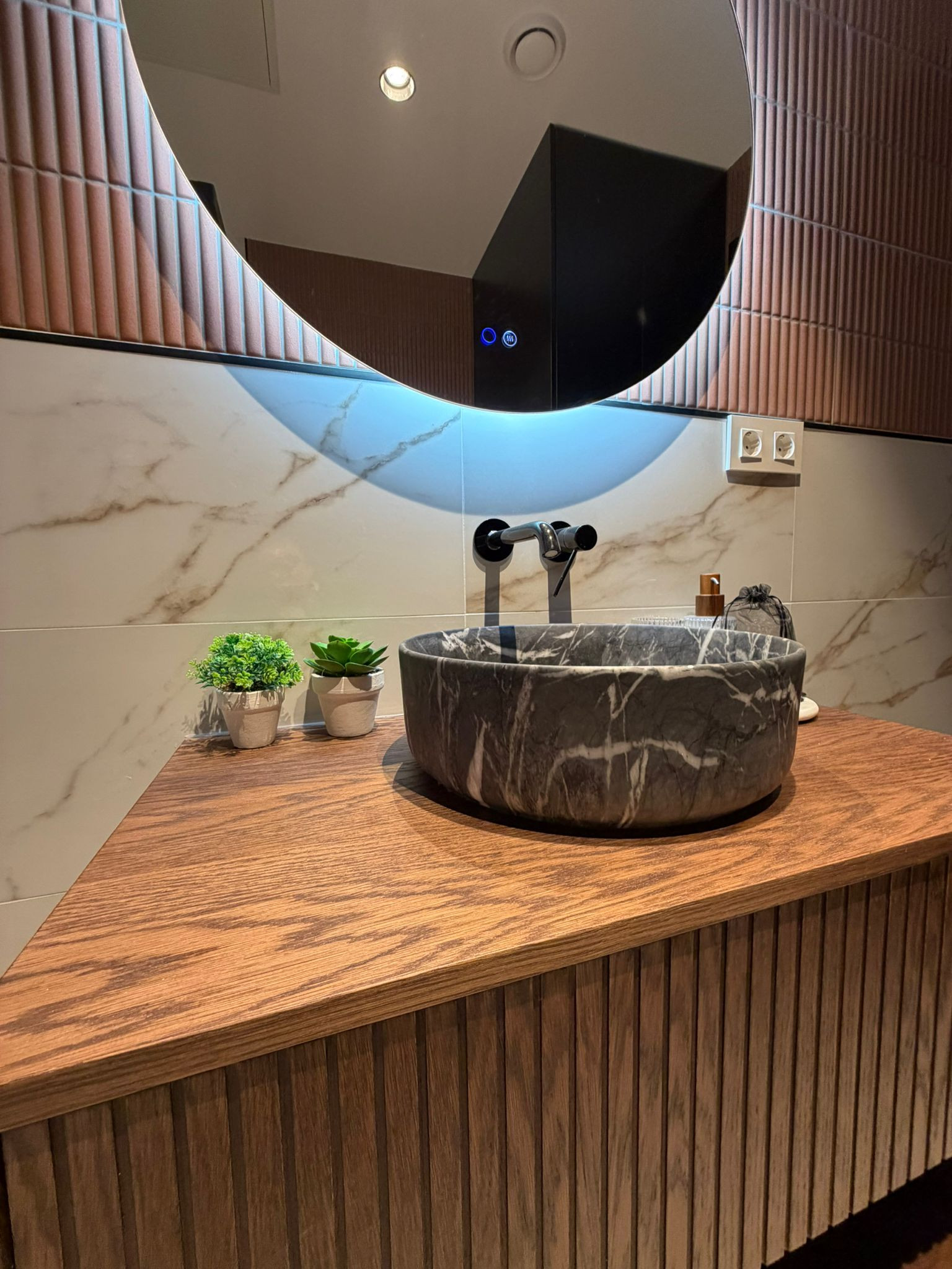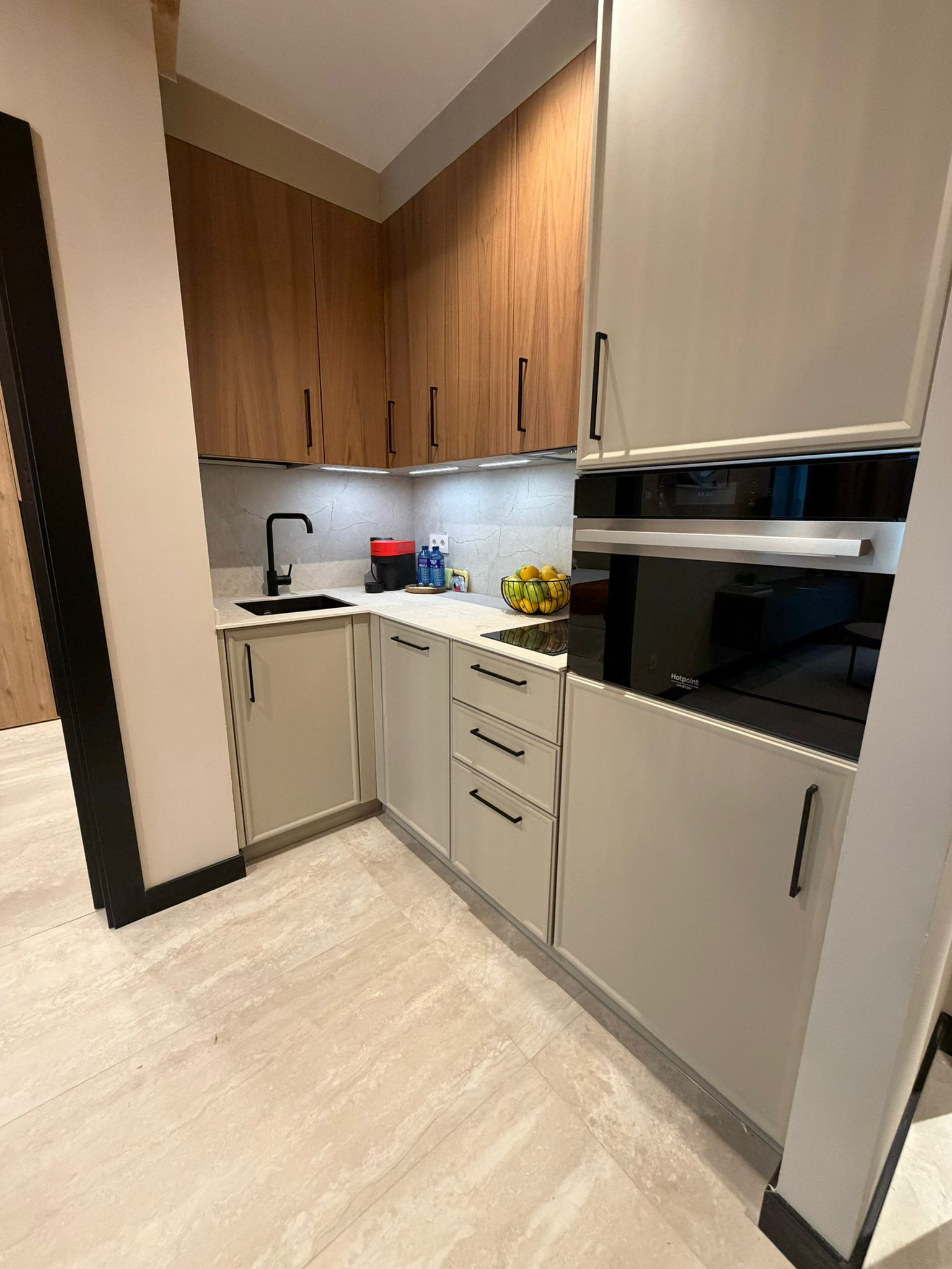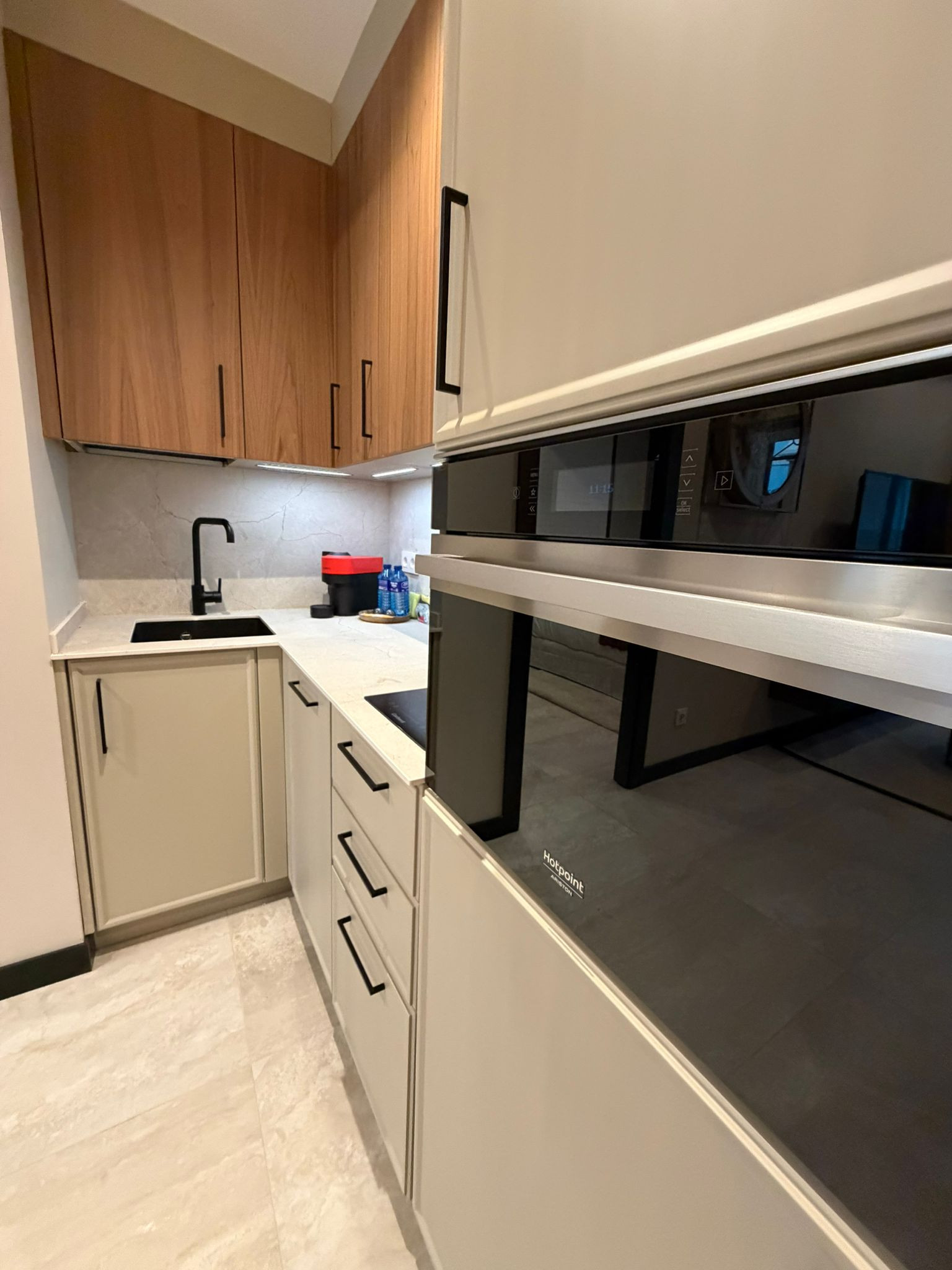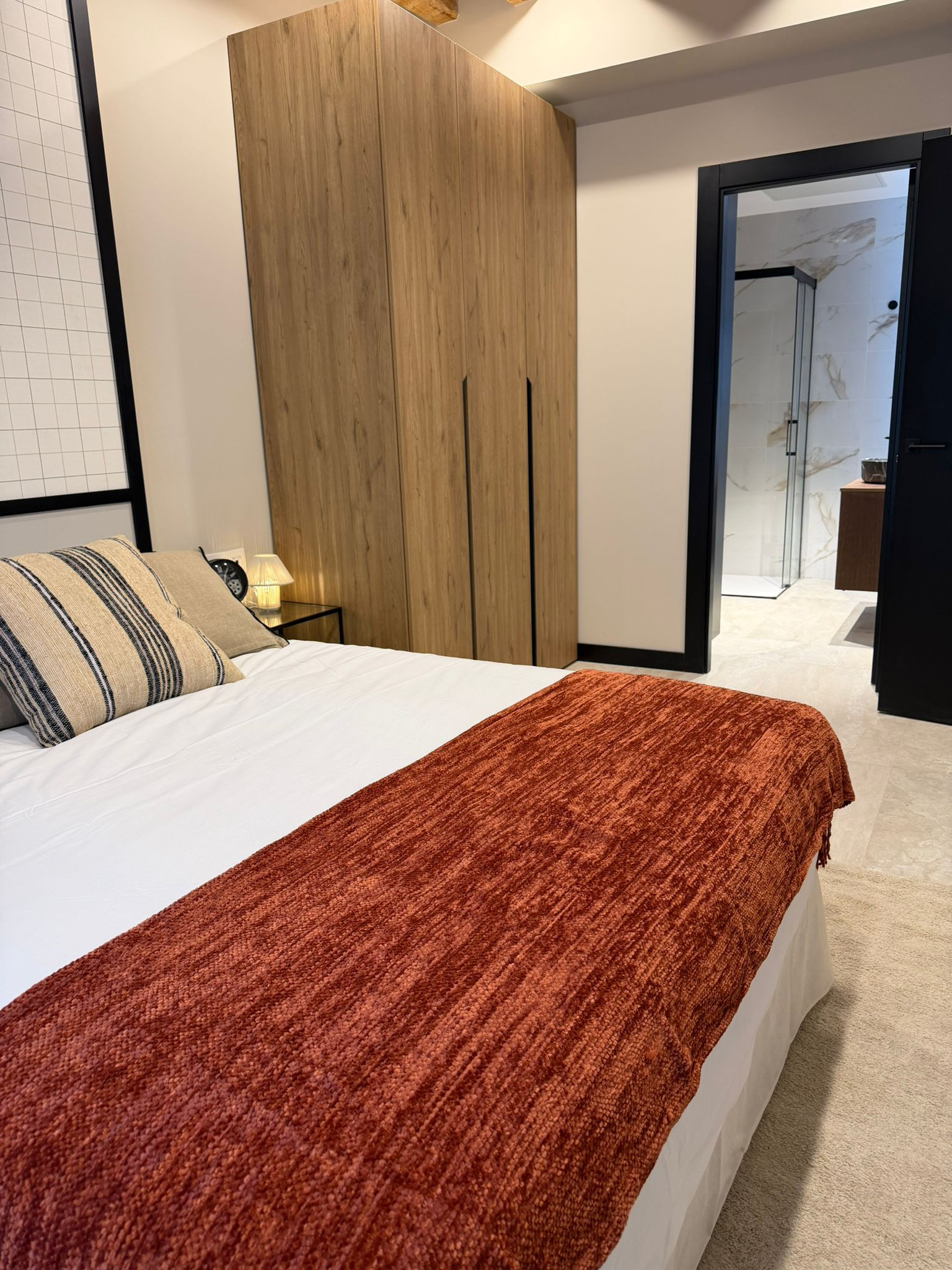 La cocina americana está totalmente equipada con electrodomésticos de última generación, incluyendo nevera, congelador, lavadora, lavavajillas, horno, microondas, cafetera, tostadora y menaje completo. Es un espacio perfecto para preparar comidas rápidas o desayunos antes de comenzar el día.