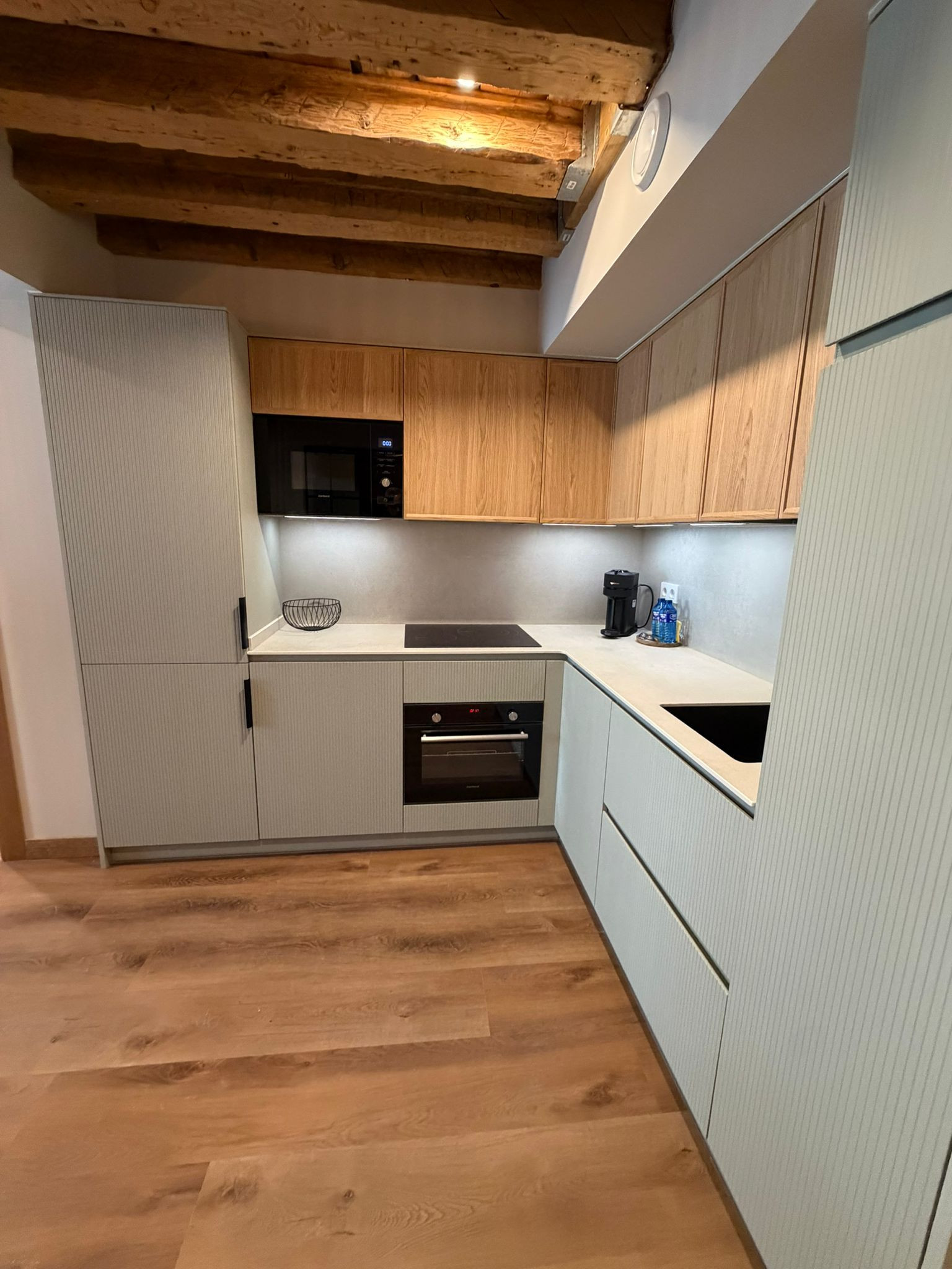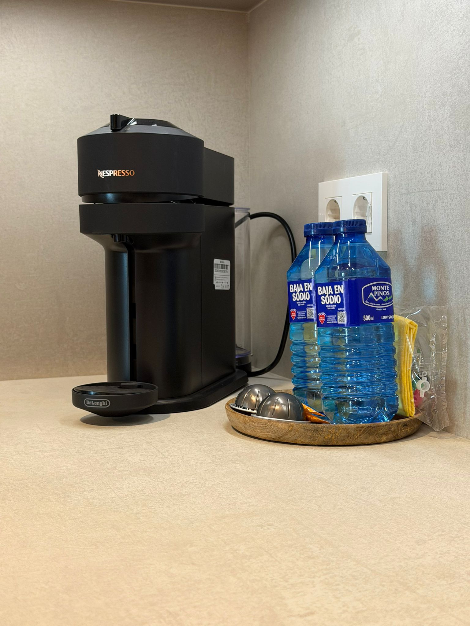La cocina americana está completamente equipada con electrodomésticos de última generación, incluyendo nevera, congelador, lavadora, lavavajillas, horno, microondas, cafetera, tostadora y menaje completo. Es ideal para preparar comidas y disfrutar de momentos gastronómicos en familia o con amigos.